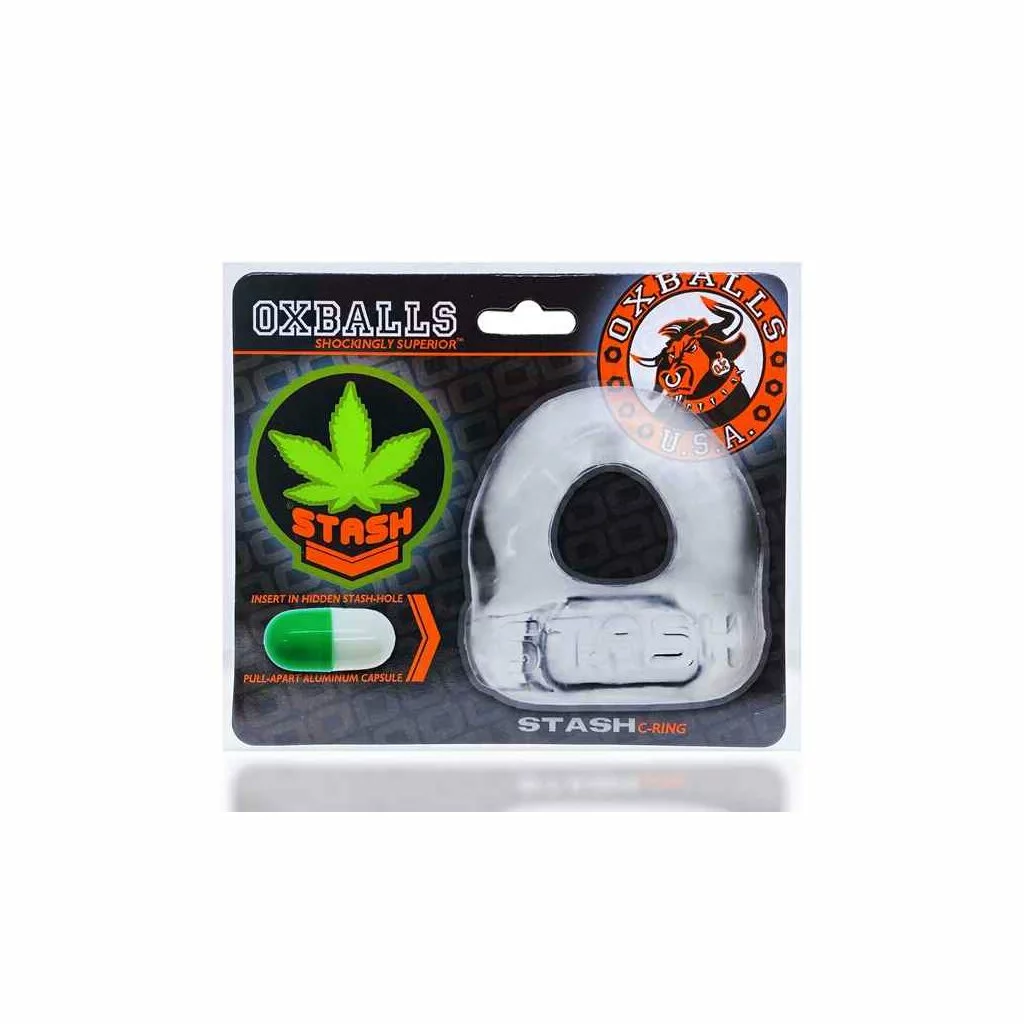 STASH Cockring ist ein großer Cockring. Das dickere Polster schiebt man hinter den Sack und drückt ihn so nach aussen und oben. Aber es gibt mehr, eine versteckte Tasche an der Basis des Rings. Die Kunststoff-Kapsel passt dort genau hinein, um zu verstecken, was auch immer Sie versteckt halten wollen.